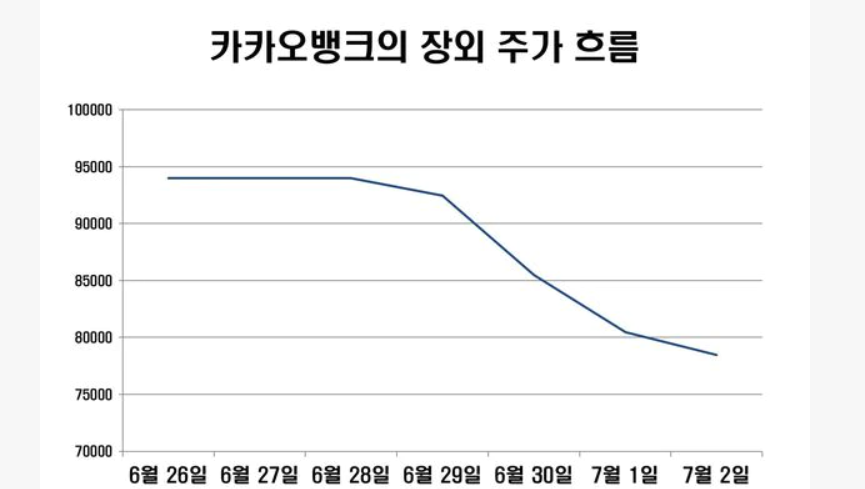카카오 뱅크의 상장이 다가오는 시점에서 악재가 나오는 부분이 있다. 바로 카카오 뱅크의 장외 거래 가격이 최근 하락세를 보이고 있다. 10만 원까지 바라보던 장외거래 가격은 어느새 7만 원대로 떨어진 상태이다. 카카오 뱅크의 신청 주가가 3만 원대의 희망 공모 금액인 점을 감안하면, 상장 후 2배의 따상이라고 불리는 대박이 나야 가능하므로, 최근 급등한 주식 시장을 감안하면, 부정적인 시각도 있다. 얼마 전 상장한 SK IET의 따상이 실패한 이후에는 조금 조심하는 분위기이다.