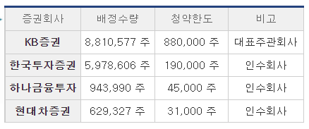 카카오 뱅크의 대표 주관사는 KB증권이다. 그리고, 한국투자증권과 하나금융투자, 현대차 증권도 공동 주관사로 진행이 된다. KB 주관사가 가장 많은 8,810,577 주를 배정받았으며, 가장 작은 현대차 증권은 629,327주를 배정받은 상태이다. 증권사마다 배정 수량이 차이가 나지만, 반면 경쟁률에서도 약간의 눈치 싸움이 예상된다. 인기 몰이가 예상되는 종목으로 청약 계좌별로 1주에서 2주의 최소 배정이 진행될 것으로 예상된다.